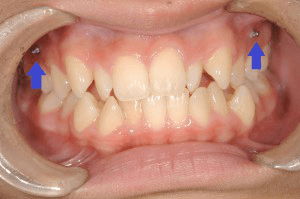 矯正治療では、ある歯を動かすと他の歯に必ず反作用が発生し、動いてほしくない歯まで動いてしまいます。そうすると、予定していた歯の移動ができなくなります。そこで、今まではヘッドギア-や顎間ゴム、ホールディングアーチなど固定源を考えて、患者様の協力とともに固定源の確保をしていましたが、患者様の協力度によって、治療が左右されることにもなりました。矯正用ミニインプラントを使用することで、安定した固定源が確保できることになり、より確実に治療目標を達成できるようになり、快適に治療ができるようになりました。症例によっては治療期間の短縮につながることがあります。
