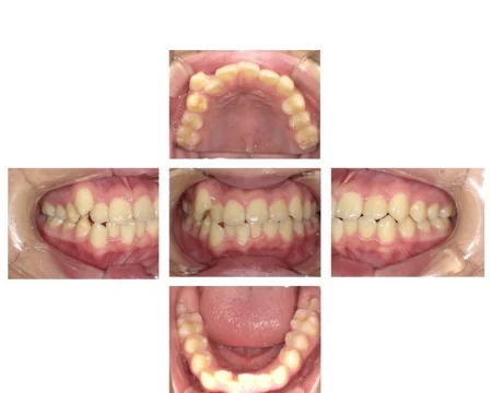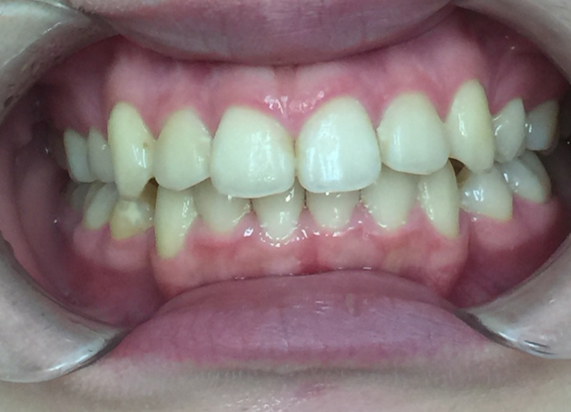 また、前歯(中切歯/1番)を噛み合わせた時に上の歯と下の歯の真ん中である「正中(せいちゅう)」が不一致で、歯並びが悪くガタガタな「叢生(そうせい)」の状態でした。