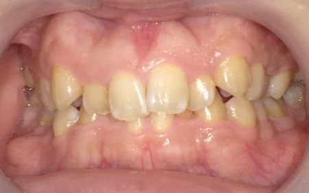 拝見したところ、全体的に歯の黄ばみが見られました。
