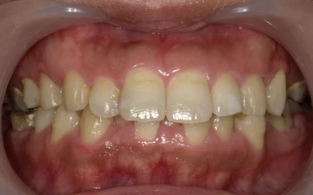 拝見したところ、全体的に歯が黄ばんでいて、口元が暗い印象でした。