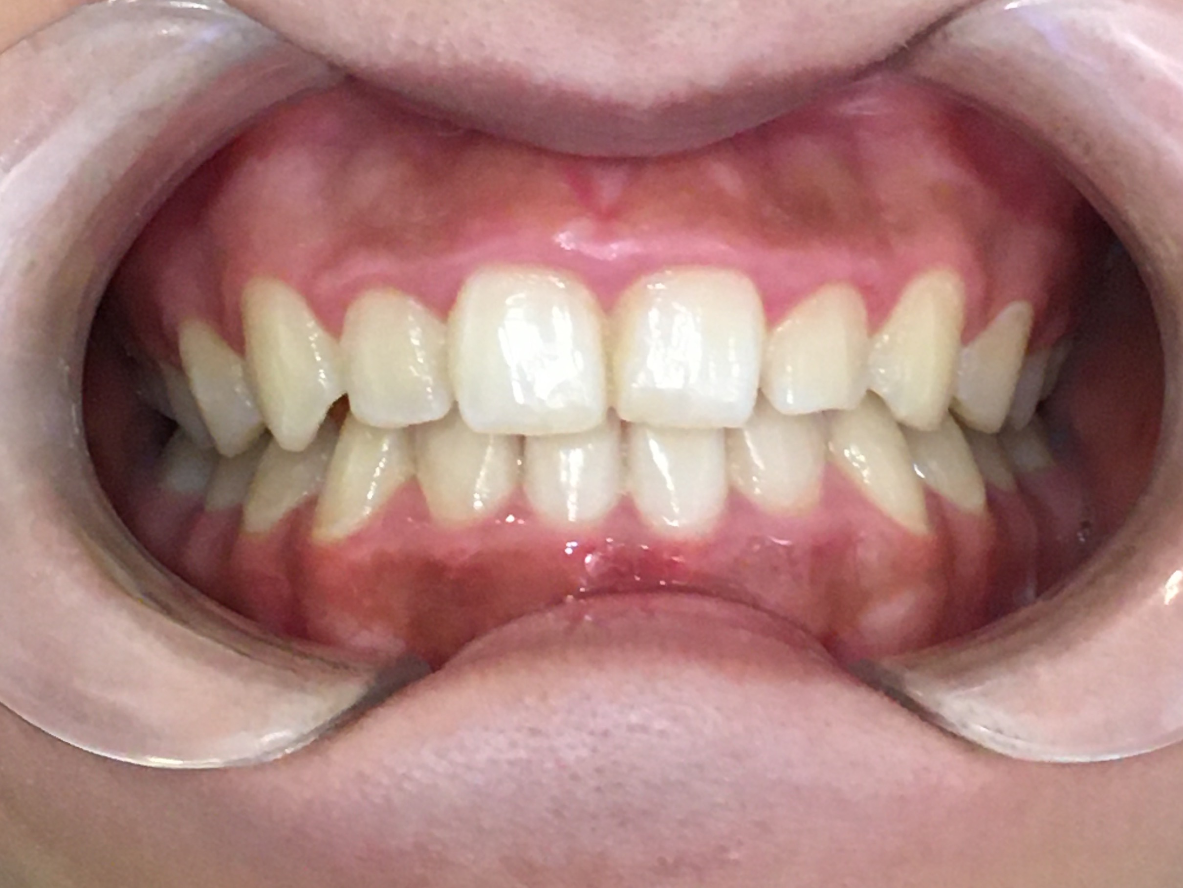 拝見すると、上の前歯2本(中切歯/1番)が中心に向かって少しねじれて生えていました。