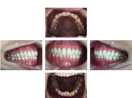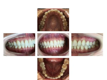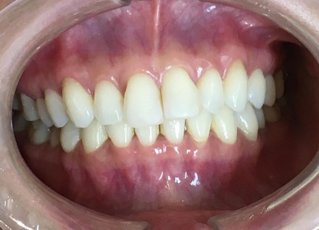 下の前歯がまっすぐに整い、上の前歯の修復部分が欠けなくなりました。噛み合わせも問題ありません。
