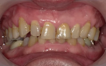拝見したところ、全体的に歯の黄ばみが強く、歯を白くする「ホワイトニング」が必要な状態でした。