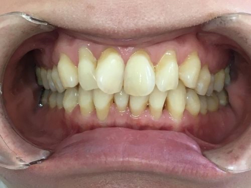 拝見したところ、歯並びが少しデコボコとしている軽度の「叢生(そうせい)」が上下の前歯に認められました。
