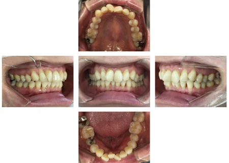 特に上の前歯(左右中切歯/1番)はねじれて前方に突き出ており、噛み合わせも悪くなっていました。