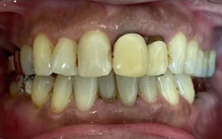 レジン部分は劣化により黄ばみ、周囲の歯との色の違いが明確でした。