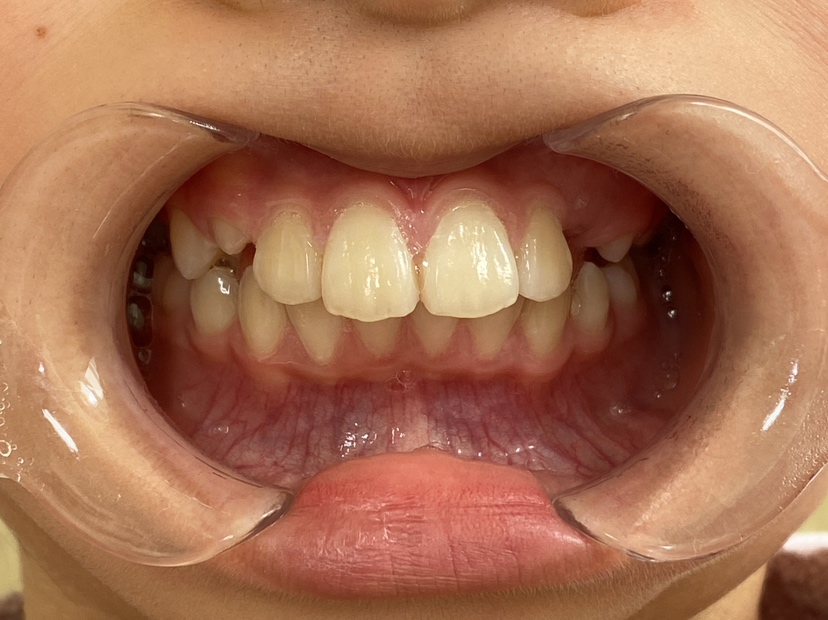 マイオブレースにより、お口の筋肉が正しく発達し上顎の突き出しは改善されましたが、このまま治療を進めると、スペースが足りないことで左上の前歯(犬歯/3番)が八重歯になりそうでした。