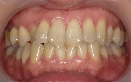 特に上下左右の糸切り歯(犬歯/3番)は黄ばみが強く、他の前歯と比べると色に差がある状態でした。