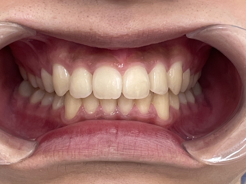 同時に前歯を下げ、上下の歯の真ん中「正中」が揃うように意識しながら歯を動かしました。