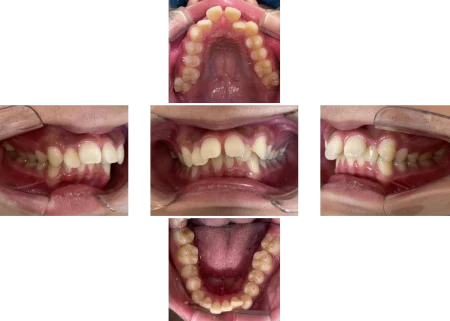また左上の前歯(犬歯/3番)は、歯の並び「歯列」からはみ出して生えている「八重歯」の状態で、下の前歯(左右中切歯、側切歯/2番、犬歯)には、デコボコに並ぶ「叢生(そうせい)」が見られました。