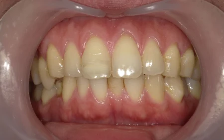 拝見したところ、全体的に歯の黄ばみが見られました。