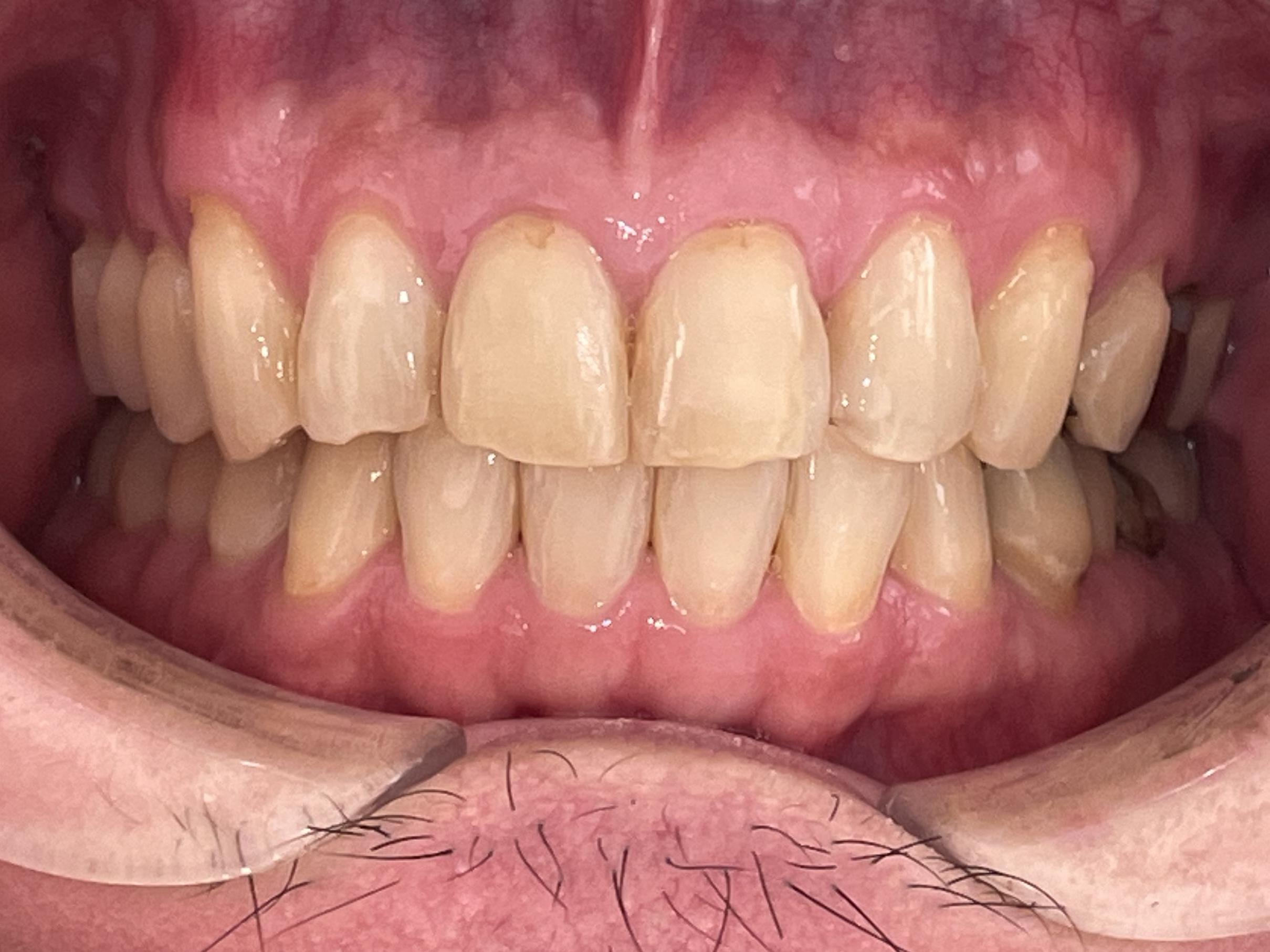 拝見したところ、歯が正常な位置からずれたり傾いたりしてデコボコに生えている「叢生(そうせい)」が上下の歯並びに認められました。