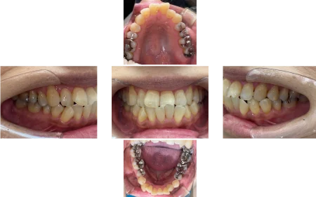 上下左右の前歯6本(中切歯/1番、側切歯/2番、犬歯/3番)は、歯が重なり合ってデコボコに生えている「叢生(そうせい)」で、適切な位置からずれているため、咬み合わせが悪くなっていました。